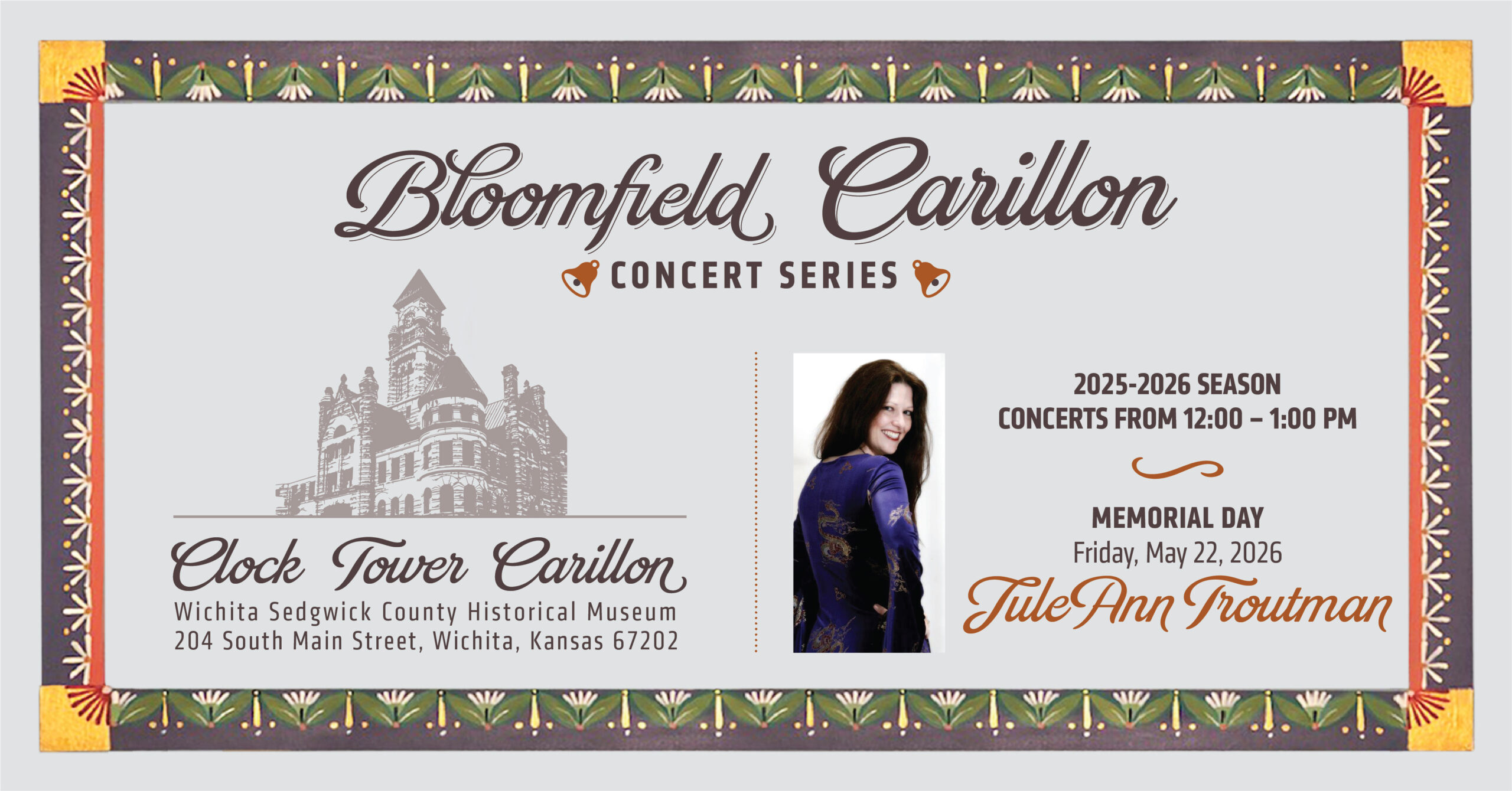 « All Events Bloomfield Carillon Concert (Memorial Day)  DATE & TIME  May 22, 2026 @ 12:00 pm - 1:00 pm COST / FEE Free GET TICKETS https://www.wichitahistory.org/?event=bloomfield-carillon-concert-memorial-day-2 EVENT DETAILS Bloomfield Carillon Concert (Memorial Day) May 22, 2026 @ 12:00 pm - 1:00 pm Come out to the Wichita-Sedgwick County Historical Museum for a free lunchtime […]