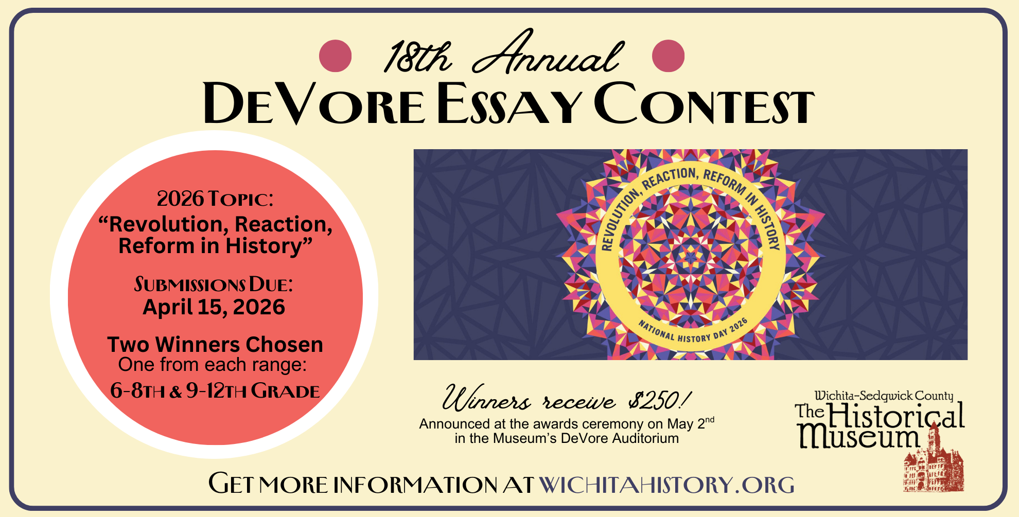 « All Events DeVore Essay Contest at the Historical Museum – “Revolution, Reaction, Reform in History” DATE & TIME April 15, 2026 COST / FEEGET TICKETS https://www.wichitahistory.org/?event=18th-annual-essay-contest-deadline-revolution-reaction-reform-in-history EVENT DETAILS DeVore Essay Contest at the Historical Museum – “Revolution, Reaction, Reform in History” April 15, 2026 The Historical Museum presents our 18th Annual DeVore Essay ContestSponsored by […]