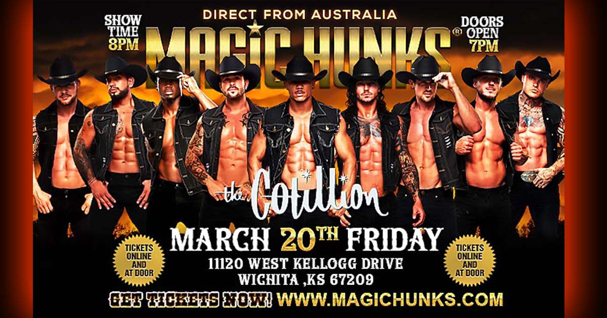 Mar 20 Direct from Australia: “Magic Hunks” LIVE ON STAGE! at The Cotillion 8:00 pm The Cotillion 11120 West Kellogg St., Wichita Event Details Get Directions