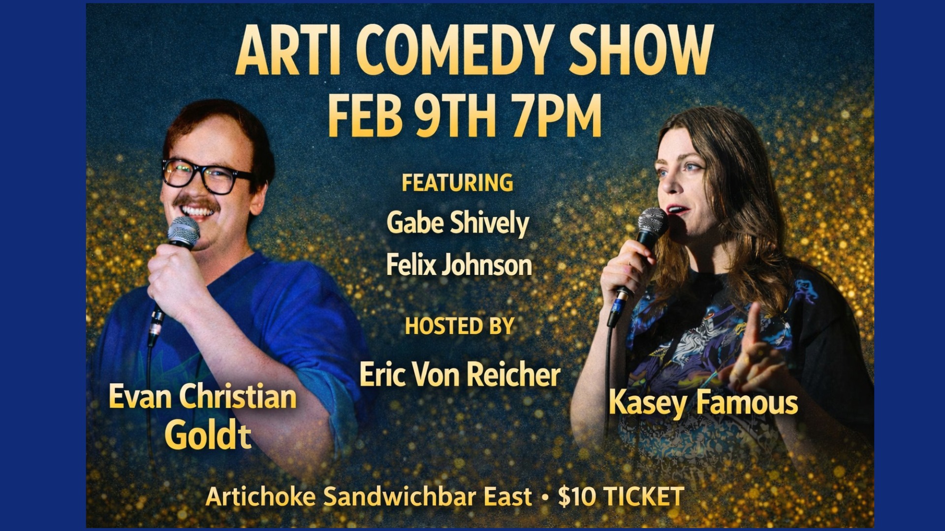 Feb 9 Arti Comedy Show feat. Kasey Famous & Evan Christian Goldt at Artichoke Sandwichbar EAST 7:00 pm Artichoke Sandwichbar EAST 2959 N. Rock Rd., Wichita Event Details Get Directions