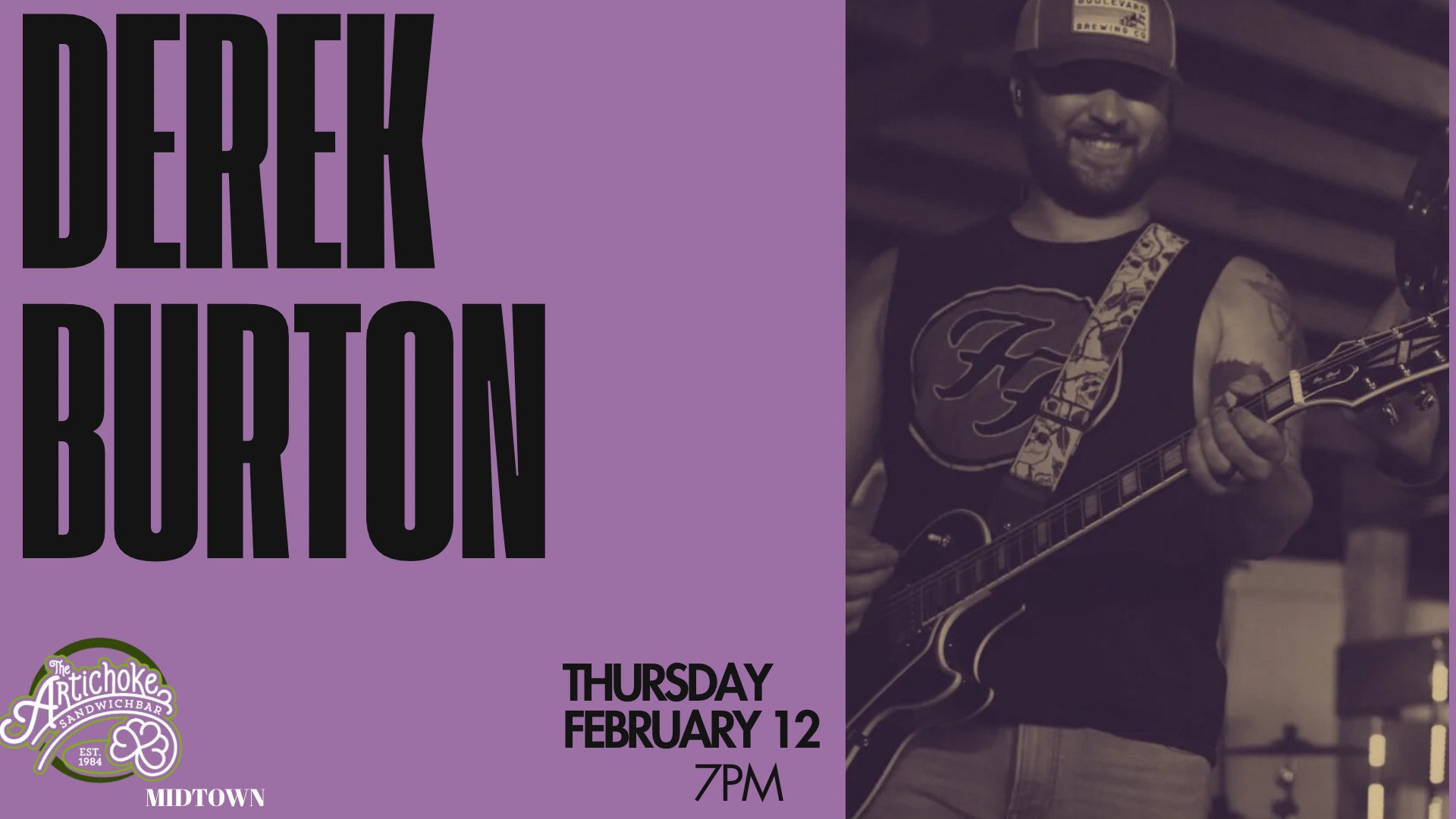 Derek Burton LIVE! at Artichoke Sandwichbar MIDTOWN Feb 12 Derek Burton LIVE! at Artichoke Sandwichbar MIDTOWN 7:00 pm Free